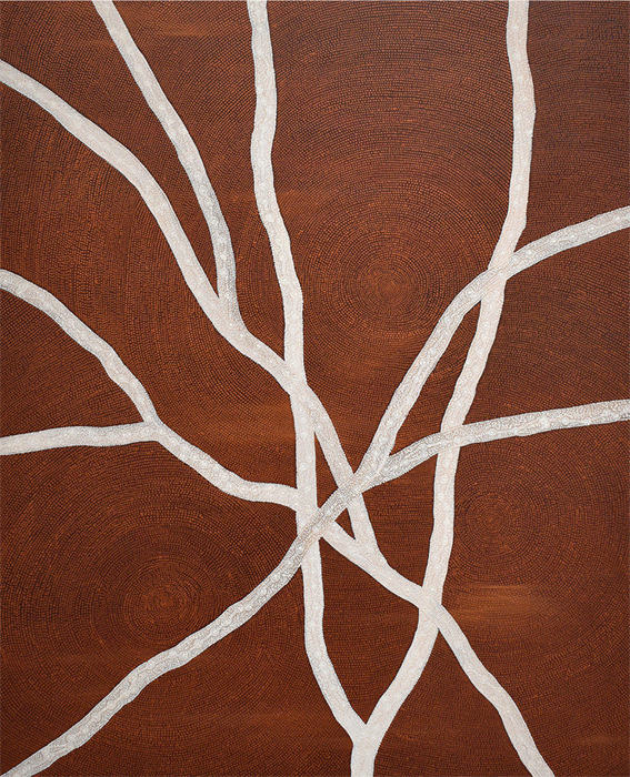Peindre, pour Niah Juella McLeod, est un geste de reconnexion. À ses racines, à sa langue, à son territoire, mais a ussi à son souffle intérieur. Niah développe une pratique intuitive, presque méditative, où chaque point, chaque ligne, devient un souffle, un lien, un souvenir. Son animal totem, la chouette Ninoxe, guide silencieux, veille dans l’ombre de ses compositions, rappelant l’importance des présences invisibles et de la mémoire partagée. Son langage plastique puise dans les techniques de la peinture aborigène traditionnelle : pointillisme, motifs circulaires, lignes ondoyantes, qu’elle revisite.