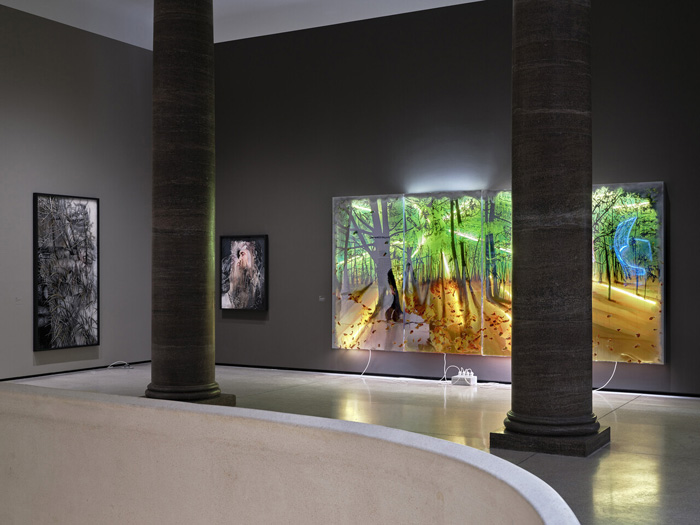 In the exhibition, sunsets and tropical forests shine out at the viewer from paintings and light boxes, their slowly pulsating light creating an enigmatic atmosphere. With a work conceived especially for the show, he moreover reacts to the architecture of the place: a curtain nearly six metres high echoes motifs from the seemingly paradisiacal landscapes around it. The visitors are invited to step through the curtain and take a look at what is behind.