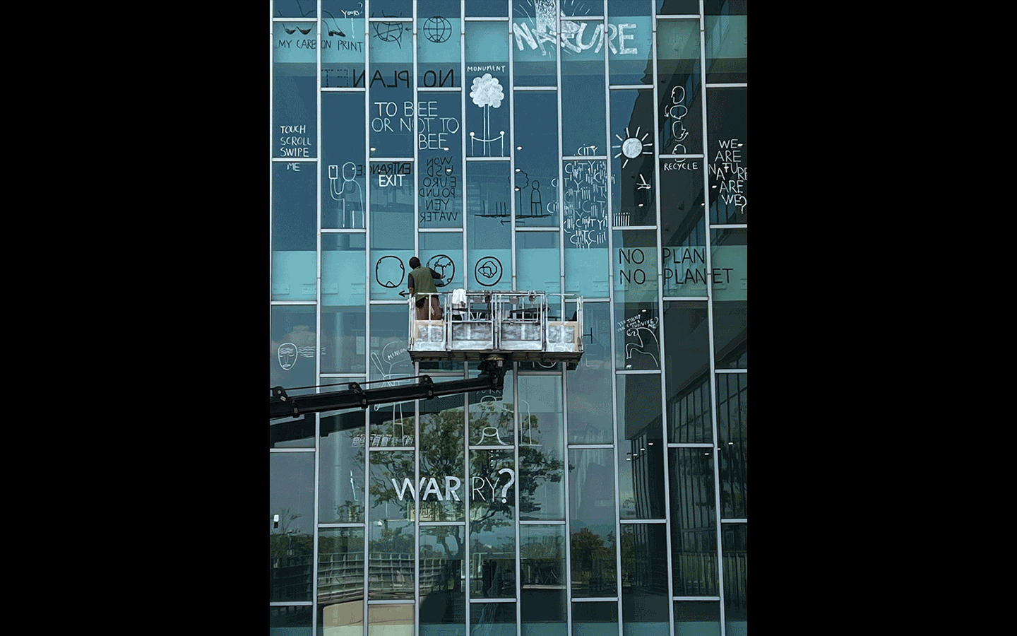 [1] Dan Perjovschi, Climate Drawings—Human Nature, 2023. Makers drawing on glass, dimensions variable. Commissioned by Busan MoCA. [2] YOUNG-